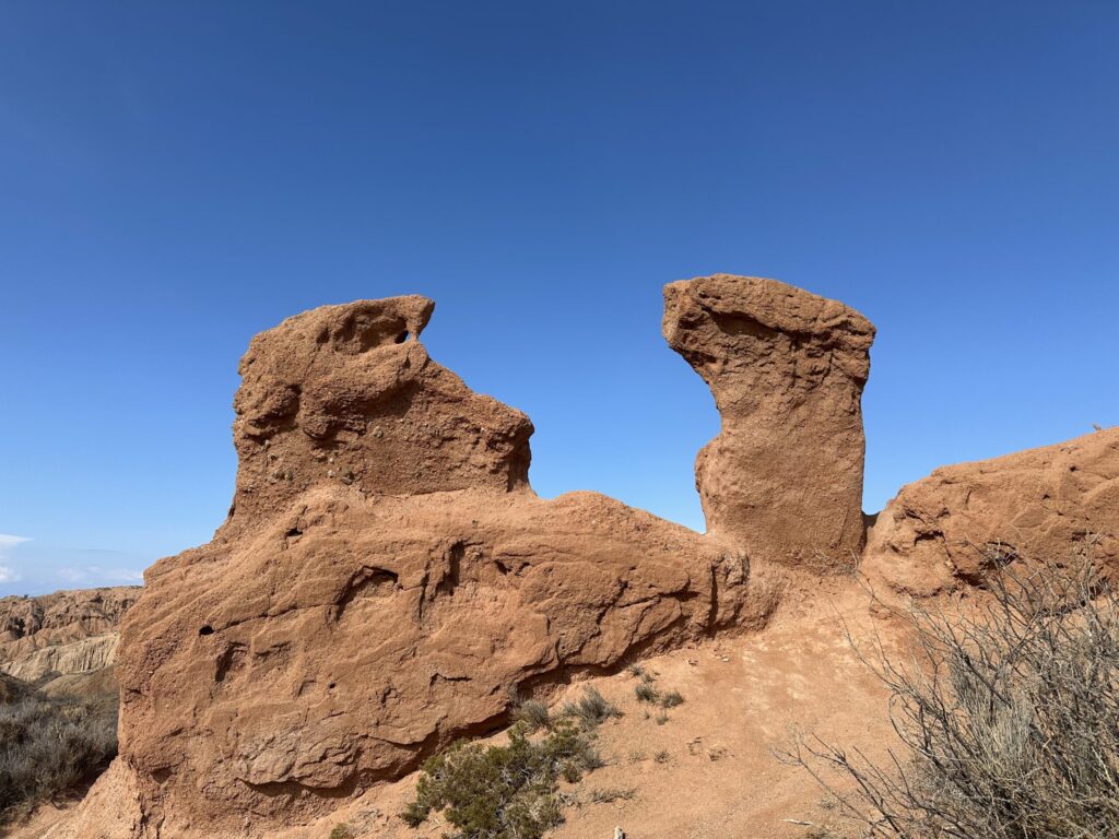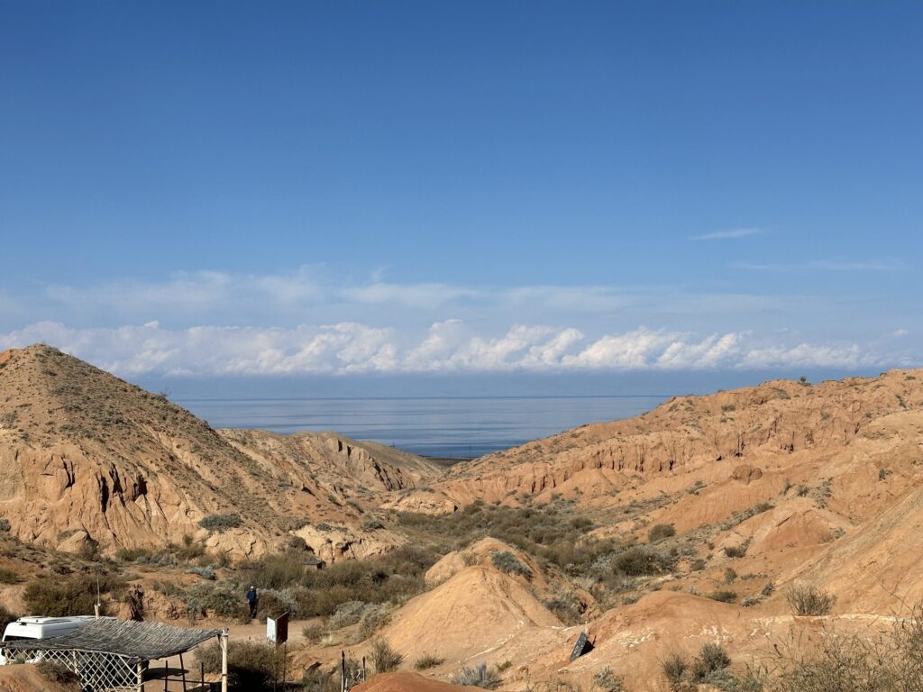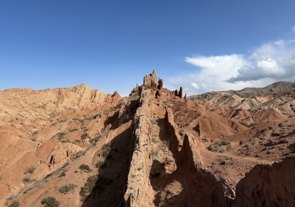 この渓谷には、赤茶色の火山岩が風化してできた奇岩が無数に存在し、それぞれがまるで城や塔のような形をしています。長い年月をかけて自然が彫り上げたこの風景は、写真では伝えきれない迫力と美しさ。遠くにはイシク・クル湖の青い水面を望むこともでき、赤と青のコントラストが心を打ちます。