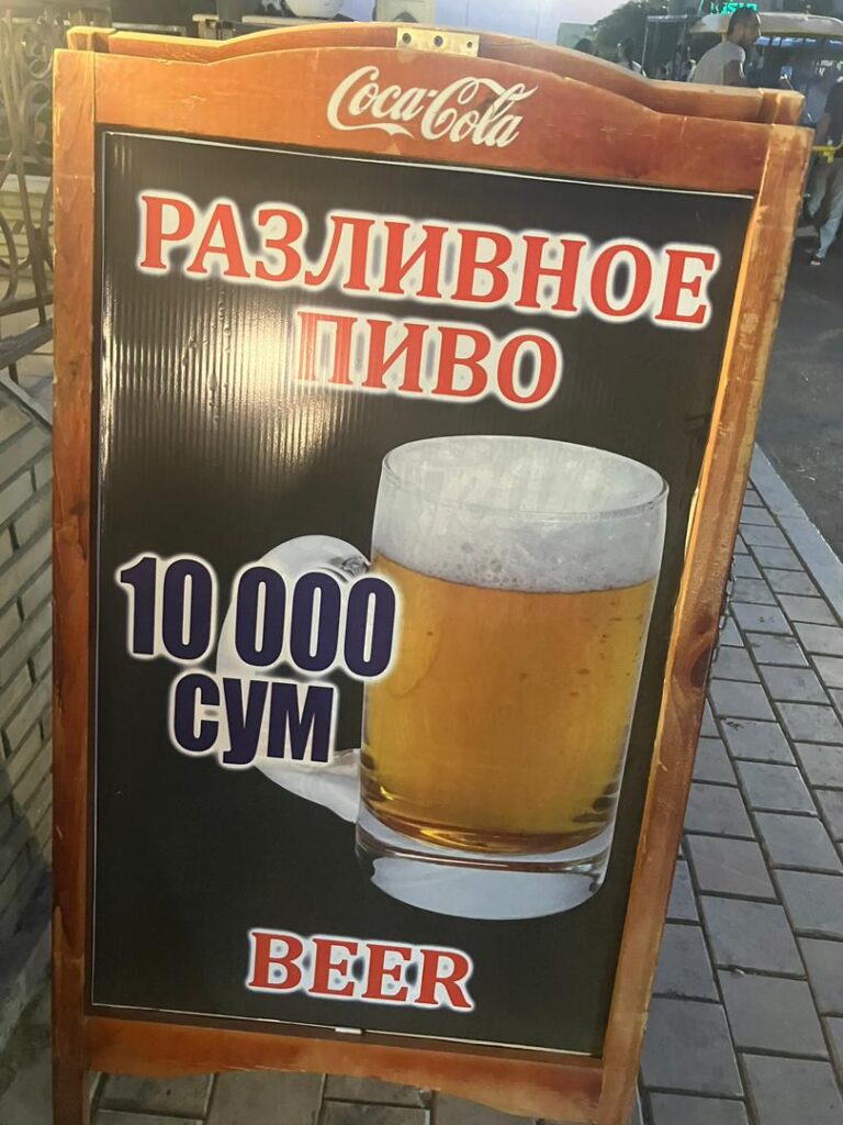 ラビハウズ付近の広場で物色していると、なんとこんな看板が!生ビール1杯10000ソム、約120円。日本の価格と比べるととても魅力的に感じられます。中央アジアは全般的に地元の生ビールが安い傾向にありますが、観光地でこの値段は破格。誘惑に負けてつい1杯注文してしまいました。
