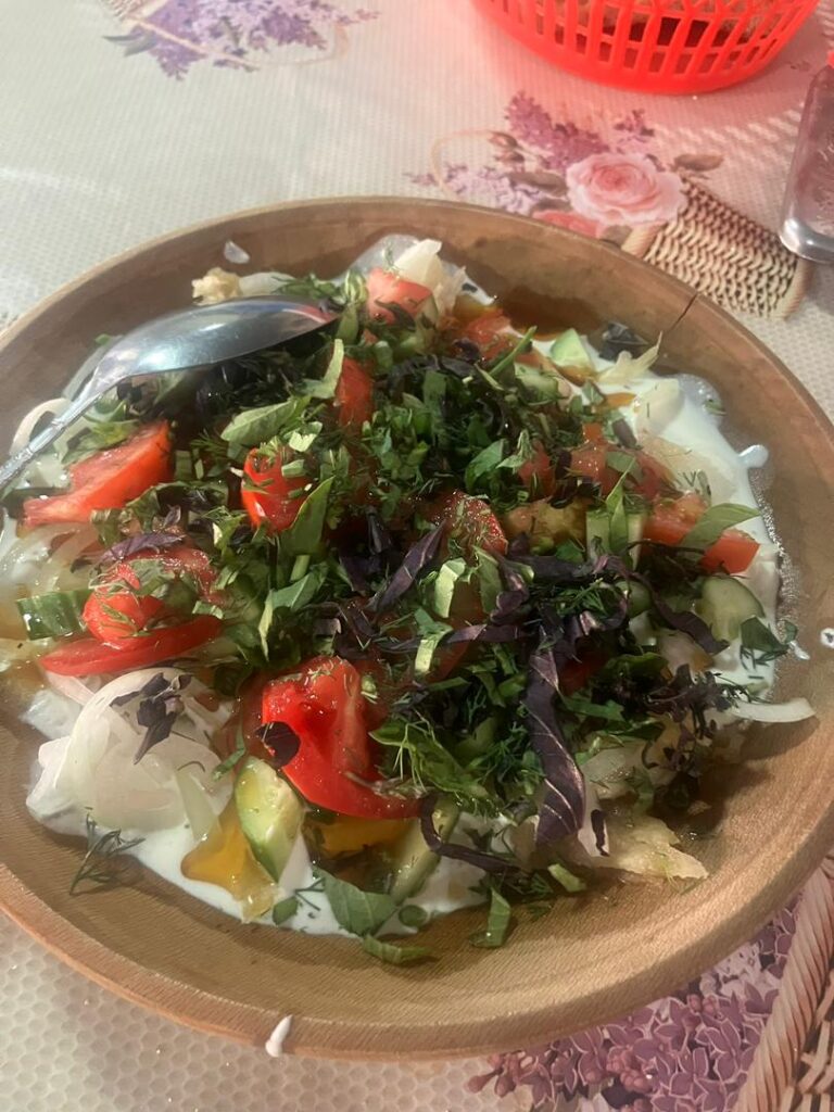 また、タジキスタンの国民食とも言われている伝統料理「クルトーブ」も、ドゥシャンベの大衆食堂で食べられます。乾燥カッテージチーズの「クルト」を水で溶いて、野菜と細かく刻んだナンにかけて、溶かしたバターかアマニ油をかけて和えた料理です。サラダのような見た目ですが、油がしっかり使われているので実はボリューミー。時々生唐辛子をかじりながら食べると味変になって美味しい!ちなみに、店主さん曰く「フォークやスプーンを使わずに手で食べるのが現地流」だそう。家庭の食事からお祝いの行事の場まで、様々な場面で食されているそうです。