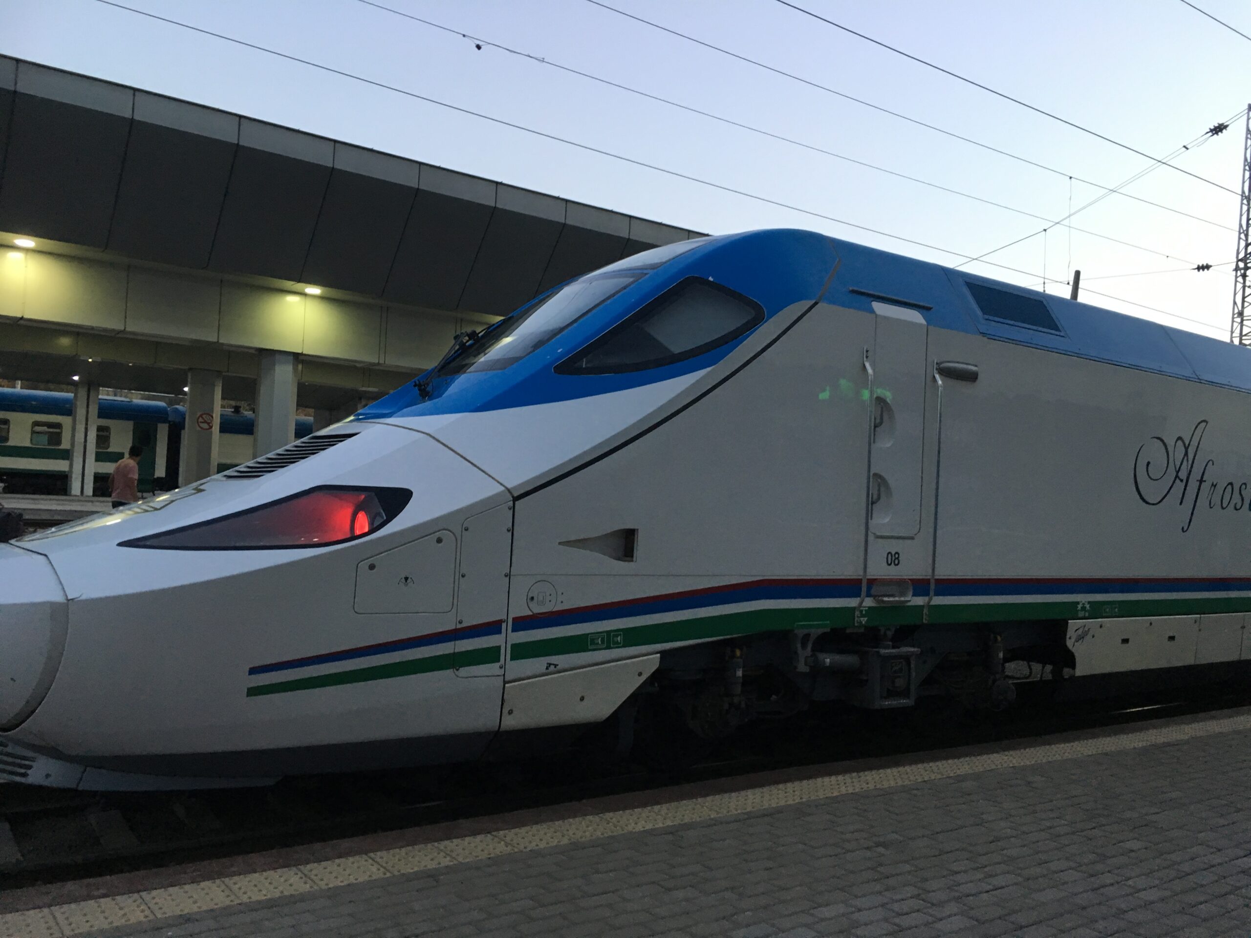 サマルカンドへの移動には特急列車アフラシヤブ号を利用。快適な鉄道旅で各地をスムーズに巡ります。